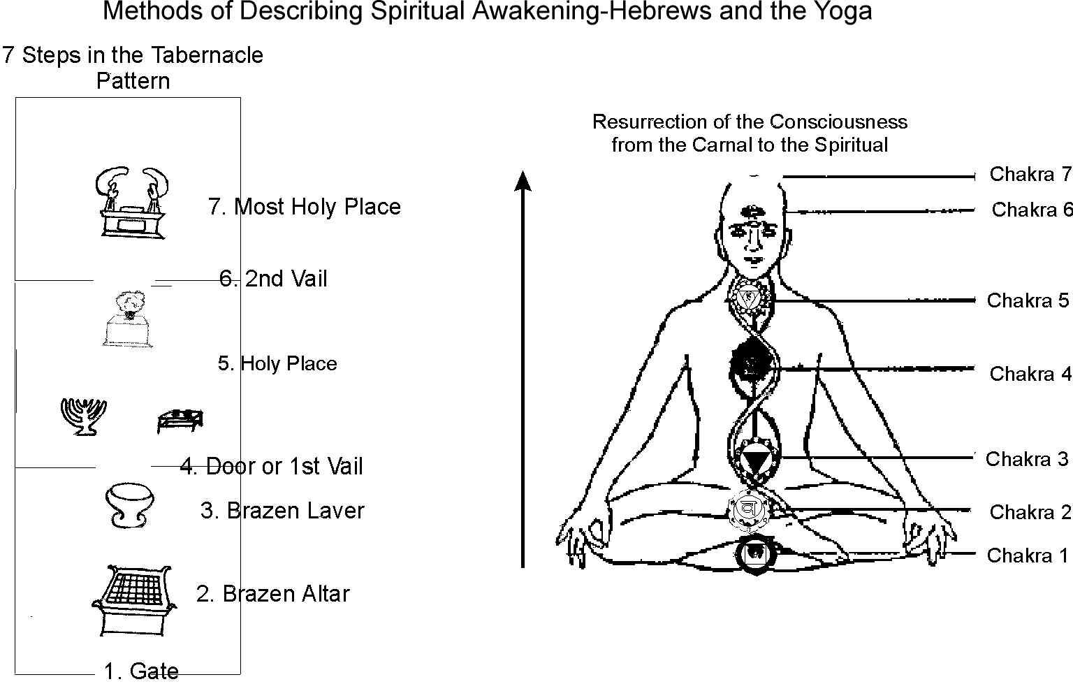 Symbolically, ascending from the Court Round About compartment, where one is totally ignorant of the Spirit, to the Most Holy Place where one is united with the Spirit, is very similar to the rising of the seven Chakras and the kundaliniboth show forth a spiritual awakening or transformation.